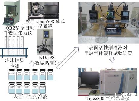 試驗流程如圖1所示。將兩種表面活性劑配置質量分數(shù)為0.01%、0.02%、0.05%、0.1%、0.15%的溶液,使用QBZY全自動表面張力儀對不同質量分數(shù)表面活性劑溶液以及去離子水進行表面張力測量,NDJ-9S數(shù)顯粘度計測表面活性劑溶液黏度,注氣法檢測溶液泡沫性質,蔡司stemi508體式顯微鏡觀察泡沫形態(tài)。上述基礎參數(shù)測定結束后,使用自行研制的表面活性劑溶液對甲烷緩釋試驗裝置進行泡沫對甲烷緩釋效應影響試驗,并采用Trace300氣相色譜儀定量檢測分析。