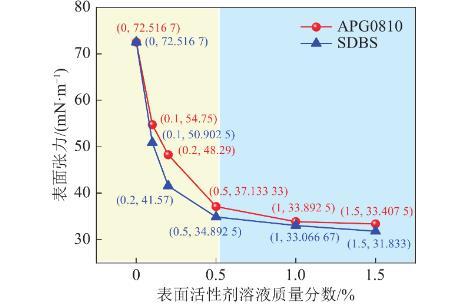 SDBS和APG0810表面活性劑溶液表面張力隨質量分數(shù)變化如圖4所示,隨著表面活性劑溶液質量分數(shù)增加,表面張力逐漸降低,降低幅度逐漸減緩。
