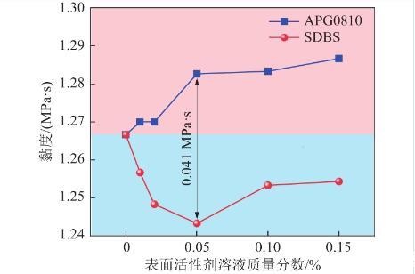 在質量分數(shù)為0.05%時兩種表面活性劑溶液黏度相差0.041 MPa·s,達到最大值,這是由于在該質量分數(shù)下SDBS溶液未形成膠束,且離子之間斥力最大,而APG0810溶液開始形成膠束,溶液內分子間碰撞概率變大。
