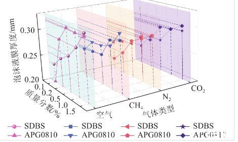 對比相同質量分數(shù)下不同氣體注入時表面活性劑泡沫液膜厚度進行分析。注入空氣情況下,溶液質量分數(shù)0.15%時,APG0810溶液在泡沫液膜最大,約為0.315 mm,注入甲烷泡沫液膜厚度比空氣低0.006 mm,SDBS溶液泡沫液膜厚度為0.297 mm,注入甲烷泡沫液膜厚度比空氣低0.004 mm,這是由于甲烷氣體密度低于空氣,擴散速率比空氣快。APG0810和SDBS溶液在二氧化碳注入時比空氣分別低0.002 mm和0.004 mm。這是由于二氧化碳氣體為酸性氣體,離子型表面活性劑溶液在酸性環(huán)境不易形成泡沫液膜結構,非離子表面活性劑溶液則不易受酸堿度干擾。