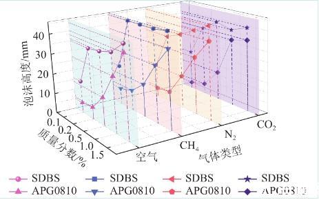 對比同一種溶液通入不同氣體的高度進行分析,空氣、氮氣及二氧化碳注入液體發(fā)泡性規(guī)律基本一致,均在質量分數(shù)最高時發(fā)泡率達到最大。通入甲烷時則在SDBS溶液質量分數(shù)為0.02%時就達到了與0.15%接近的發(fā)泡高度。APG0810在甲烷注入時也比其他氣體總體發(fā)泡率高,這是由于甲烷的摩爾質量最低,氣體密度低,分子擴散快,泡沫膨脹速率變快導致的。