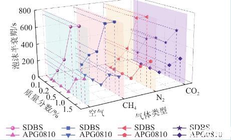 空氣、甲烷及氮氣的穩(wěn)泡性規(guī)律大致相同,注入空氣情況下,SDBS溶液質量分數(shù)為0.15%時泡沫半衰期約為786.5 s,二氧化碳注入液體的穩(wěn)泡性明顯下降,質量分數(shù)為0.15%時為584 s,比空氣低202.5 s。推測這是由于二氧化碳為酸性氣體,表面活性溶液在酸性環(huán)境下泡沫穩(wěn)定性不足,泡沫液膜強度不易控制酸性氣體造成的。而APG0810表面活性劑溶液泡沫半衰期在四種氣體注入情況下差異不明顯,是由于APG0810為非離子表面活性劑,在溶液中不是以離子狀態(tài)存在,由此可以推出它的穩(wěn)定性高,不易受強電解質影響,也不易受酸、堿影響。