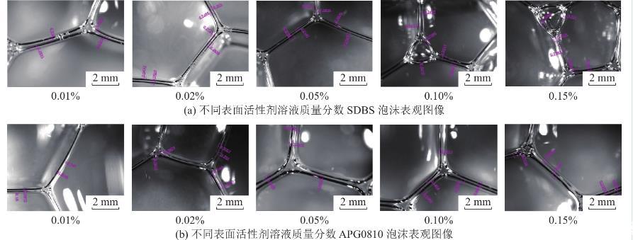 根據(jù)以上試驗結果可以獲得,溶液表面張力越小,則溶液發(fā)泡性能越好,溶液表面張力與發(fā)泡特性有較明顯相關性,而溶液黏度與泡沫性質相關性不顯著。APG0810溶液黏度隨質量分數(shù)增加而增加,發(fā)泡性及泡沫穩(wěn)定性也逐漸增加,而SDBS溶液黏度先隨著溶液質量分數(shù)增加而降低,濃度較大時有上升趨勢,溶液發(fā)泡性及泡沫穩(wěn)定性呈現(xiàn)逐漸增加趨勢,且發(fā)泡性與泡沫穩(wěn)定性均優(yōu)于APG0810溶液。