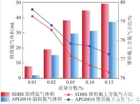 表面活性劑泡沫對氮氣緩釋作用結(jié)果如圖11所示。相同質(zhì)量分數(shù)下,SDBS溶液對氮氣的緩釋效應優(yōu)于APG0810,質(zhì)量分數(shù)為0.15%時,SDBS和APG0810溶液泡沫阻礙氮氣體積分別為49.102 mL和37.042 mL。