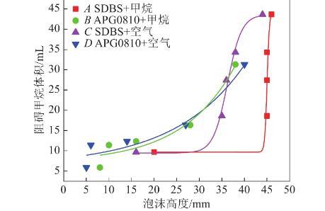 4)泡沫穩(wěn)定性是決定甲烷緩釋效應的關(guān)鍵因素,泡沫穩(wěn)定性越強,越能有效控制甲烷流動??芍苯硬扇】諝?表面活性劑泡沫的各項參數(shù)表示泡沫性質(zhì)。陰離子表面活性劑SDBS表現(xiàn)較好,泡沫穩(wěn)定性較強,隨著時間推移,SDBS也有比APG0810更好控制甲烷釋放的效果。質(zhì)量分數(shù)為0.15%時,10 min內(nèi)SDBS可以控制約占總通入甲烷體積87%的甲烷。120 min后仍可控制約占通入總體積49.16%的甲烷。