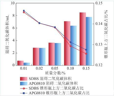 圖12為注入二氧化碳的氣相色譜檢測結(jié)果,計算出表面活性劑泡沫對二氧化碳的緩釋作用結(jié)果如圖12柱狀圖所示。相同質(zhì)量分數(shù)下,SDBS溶液對二氧化碳的緩釋效應優(yōu)于APG0810。然而兩種表面活性劑對二氧化碳緩釋效應均不顯著,SDBS表面活性劑溶液在質(zhì)量分數(shù)最大時10 min內(nèi)只控制了8.46 mL二氧化碳氣體,APG0810只控制了7.74 mL二氧化碳氣體。