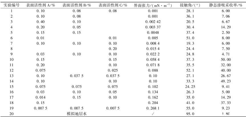 根據(jù)國內(nèi)外學(xué)者的研究,滲吸液對(duì)滲吸的影響主要是改變油水界面張力、潤濕性、乳化性和pH值。乳化性主要是通過乳化分散,從而增強(qiáng)油滴在巖心孔道內(nèi)的流動(dòng)能力;pH值則主要是影響滲吸液的乳化能力。本次實(shí)驗(yàn)采取靜態(tài)滲吸的方式,乳化性的作用相對(duì)較小,故滲吸液配制指標(biāo)為界面張力與潤濕性。