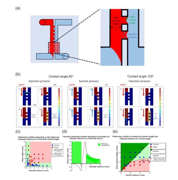 圖2展示了用于模擬液體填充和圖案化條件的數(shù)值模擬和實(shí)驗(yàn)驗(yàn)證,進(jìn)一步分析了在微流體平臺(tái)中實(shí)現(xiàn)毛細(xì)釘扎過(guò)程的成功條件。圖2a展示了與圖案化成功條件相關(guān)的物理參數(shù),包括柱子的高度、間距和側(cè)通道的長(zhǎng)度。通過(guò)這些參數(shù)的控制,可以預(yù)測(cè)液體在微柱之間的保留情況。圖2b展示了液體填充過(guò)程的數(shù)值模擬,包括在不同接觸角(例如60°和120°)條件下的液體流動(dòng)和釘扎效果。模擬結(jié)果顯示了如何通過(guò)改變接觸角和壓力控制液體在微柱之間的流動(dòng)和停留。圖2b的模擬驗(yàn)證了在較大接觸角下液體被釘扎在微柱邊緣的效果。圖2c至2e總結(jié)了不同微柱高度、間距和側(cè)通道長(zhǎng)度對(duì)液體保留過(guò)程的影響,通過(guò)這些參數(shù)優(yōu)化可實(shí)現(xiàn)液體在微柱之間的穩(wěn)定釘扎,適用于后續(xù)的細(xì)胞培養(yǎng)實(shí)驗(yàn)。