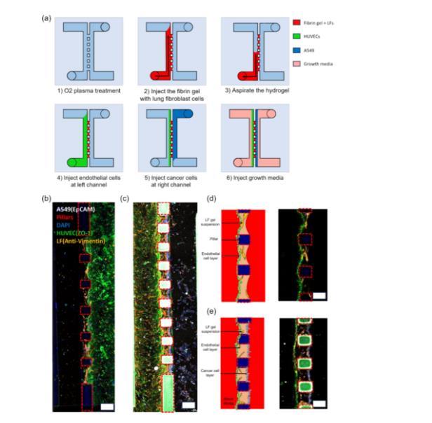 圖3通過(guò)細(xì)胞加載流程示意圖和熒光圖像,展示了微流體平臺(tái)在再現(xiàn)肺泡三維微環(huán)境方面的有效性。圖3a展示了細(xì)胞加載的步驟,包括在水凝膠薄膜兩側(cè)加入不同類型的細(xì)胞,以創(chuàng)建多層細(xì)胞結(jié)構(gòu)。圖3b和3c展示了微流體平臺(tái)上與內(nèi)皮細(xì)胞和肺成纖維細(xì)胞的共培養(yǎng)熒光圖像。水凝膠薄膜中含有橙色染色的成纖維細(xì)胞,水凝膠膜側(cè)面綠色層表示生長(zhǎng)的內(nèi)皮細(xì)胞層。這種結(jié)構(gòu)模擬了肺部的基質(zhì)和內(nèi)皮層,為后續(xù)肺部疾病研究提供了生理相關(guān)的模型。圖3d和3e分別展示了細(xì)胞配置的示意圖和最大投影的共聚焦顯微圖像。在這些圖中可以看到肺成纖維細(xì)胞(橙色)和內(nèi)皮細(xì)胞(綠色)在水凝膠薄膜的不同層次的分布情況,形成了一個(gè)三維的細(xì)胞共培養(yǎng)環(huán)境。圖像還顯示,細(xì)胞在培養(yǎng)過(guò)程中保持了較高的活力,并成功地在水凝膠薄膜周圍形成了均勻的細(xì)胞層。