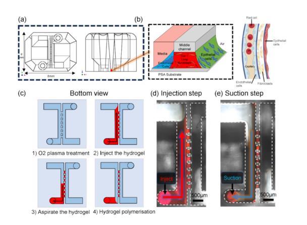 圖1展示了一個(gè)基于表面張力的開放式微流體平臺(tái)的結(jié)構(gòu)和液體圖案化過(guò)程,用于再現(xiàn)肺部的三維細(xì)胞微環(huán)境。圖1a展示了微流體平臺(tái)的頂視圖和側(cè)視圖。平臺(tái)的中心區(qū)域包含微柱陣列,用于形成薄的水凝膠膜,兩側(cè)是包含不同細(xì)胞懸浮液的流體通道。圖1b展示了水凝膠和不同細(xì)胞層的位置安排,模擬肺部細(xì)胞環(huán)境的氣-液界面結(jié)構(gòu)。圖1c到圖1e展示了圖案化過(guò)程的兩個(gè)關(guān)鍵步驟——液體注入和保持。首先,水凝膠液體通過(guò)微柱流動(dòng);當(dāng)液體達(dá)到通道的擴(kuò)展區(qū)域時(shí),使用吸取器將多余液體移除,剩余部分被保持在微柱之間形成所需的薄層。這一過(guò)程中利用了表面張力的“毛細(xì)釘扎”現(xiàn)象,即通過(guò)幾何結(jié)構(gòu)和表面特性來(lái)控制液體的流動(dòng)和停留。