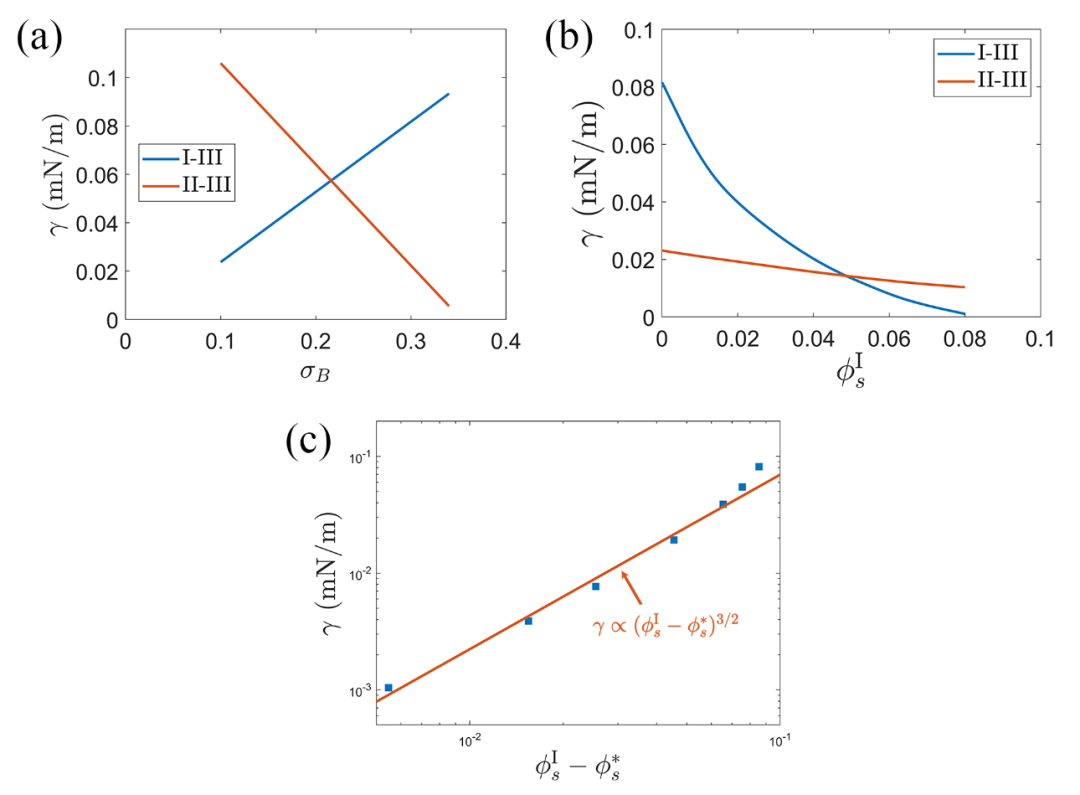 圖1.(a)I-III相與II-III相間的界面張力隨B鏈線電荷密度σB變化的曲線。(b)I-III相與II-III相間的界面張力隨外加鹽離子濃度變化的曲線。(c)接近臨界鹽時I-III相界面張力與鹽濃度之間的標(biāo)度關(guān)系。