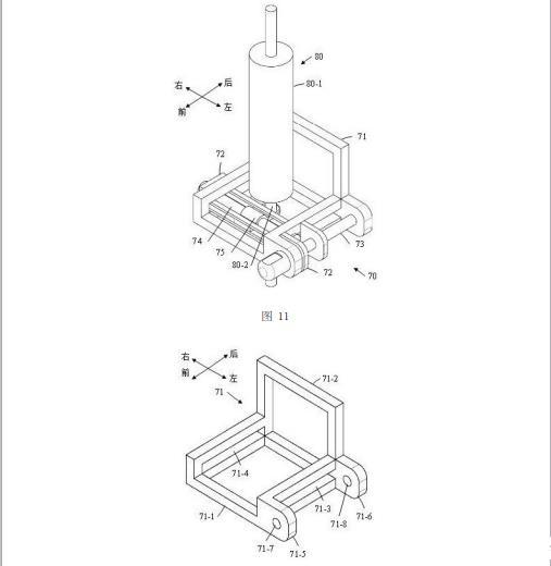 如圖12所示,固定座71整體呈L形,固定座71包括座體部71-1和背體部71-2,座體部71-1和背體部71-2均整體呈長方形,座體部71-1為閉合的環(huán)狀框體結(jié)構(gòu)且位于水平面內(nèi),背體部71-2為U形框體結(jié)構(gòu)且位于豎直面內(nèi),背體部71-2的下端與座體部71-1的后邊框固定連接使得二者整體呈L形,并且背體部71-2與座體部71-1的后邊框形成一個閉合的環(huán)狀框體結(jié)構(gòu)。座體部71-1的左邊框包括上下設置的兩根棱柱,該兩根棱柱相互平行且二者之間設置有第一方孔71-3;座體部71-1的右邊框包括上下設置的兩根棱柱,該兩根棱柱相互平行且二者之間設置有第二方孔71-4;第一方孔71-3和第二方孔71-4均沿前后方向延伸。座體部71-1的左邊框的左側(cè)面(即外側(cè)面)上固定設置有第一延伸板71-5和第二延伸板71-6,并且第一延伸板71-5和第二延伸板71-6分別位于座體部71-1的左邊框的前后兩端,第一延伸板71-5上設置有沿前后方向延伸的通孔71-7,第二延伸板71-6上設置有沿前后方向延伸的通孔71-8。