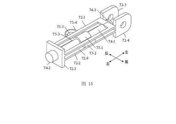 如圖10、圖11和圖14所示,滑動座72活動設置于固定座71上?;瑒幼?2的第一U形板72-1和第二U形板72-2的左端均穿入固定座71的左邊框的第一方孔71-3內(nèi),第一U形板72-1和第二U形板72-2的右端均穿入固定座71的右邊框的第二方孔71-4內(nèi);蓋形板72-3的左側(cè)面與固定座71的右邊框的右側(cè)面相抵接,使得蓋形板72-3對滑動座72起限位作用;第一尾板72-4和第二尾板72-5的右端面均與固定座71的左邊框的左側(cè)面相抵接,使得第一尾板72-4和第二尾板72-5對滑動座72起限位作用,并且第一尾板72-4和第二尾板72-5均位于第一延伸板71-5與第二延伸板71-6之間。