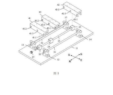 第一導桿31從前往后依次穿過第一左通孔41-1、第三左通孔43-1、以及第二左通孔42-1,第一導桿31的前端與第一左通孔41-1固定連接,第一導桿31的后端與第二左通孔42-1固定連接;第二導桿32從前往后依次穿過第一右通孔41-2、第三右通孔43-2、以及第二右通孔42-2,第二導桿32的前端與第一右通孔41-2固定連接,第二導桿32的后端與第二右通孔42-2固定連接。第一絲桿21從前往后依次穿過第一中間通孔41-3、第三中間通孔43-3、以及第二中間通孔42-3。
