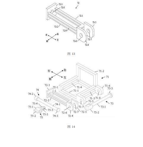 如圖13所示,滑動座72包括第一U形板72-1、第二U形板72-2、蓋形板72-3、第一尾板72-4、以及第二尾板72-5。第一U形板72-1和第二U形板72-2的開口端都與蓋形板72-3的左側(cè)面(即里側(cè)面)固定連接,并且第一U形板72-1和第二U形板72-2均與蓋形板72-3相垂直,其中蓋形板72-3沿豎直方向延伸且蓋形板72-3上設置有通孔72-8,第一U形板72-1和第二U形板72-2均沿水平方向延伸;第一U形板72-1位于第二U形板72-2的上方,第一U形板72-1與第二U形板72-2相互平行且二者之間設置有一個縫隙72-9。在本實施例中,第一U形板72-1與第二U形板72-2相同。