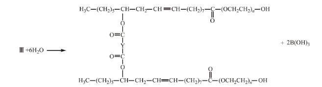 將0.12 mol聚乙二醇和0.04 mol硼酸依次裝入帶有攪拌器、分水器、回流冷凝器的三口燒瓶中,并連接減壓裝置。加熱至120℃,在負(fù)壓下進(jìn)行反應(yīng)至出水量不變,酯化過程如下所示: