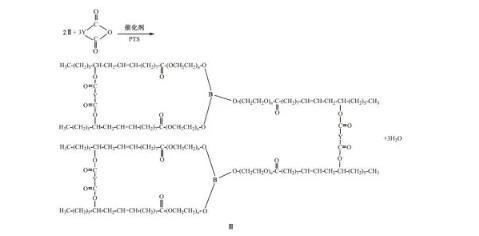 待反應(yīng)液冷卻至50℃,向反應(yīng)液中加入0.12 mol蓖麻油酸與催化劑對(duì)甲基苯磺酸(PTS的質(zhì)量為蓖麻油、聚乙二酸與硼酸總質(zhì)量的1%),升溫至140℃,在負(fù)壓下進(jìn)行反應(yīng),至體系酸值不變,酯化過程如下所示: