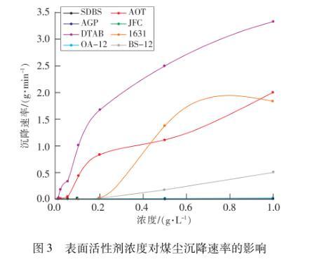 由表4和圖3可以看到,當(dāng)濃度為0.1 g/L時(shí),煤塵在AOT和APG溶液中的沉降時(shí)間不到1 min,而在陽離子和兩性型表面活性劑溶液中的沉降時(shí)間超過1 h。在同一濃度下,煤塵在不同表面活性劑溶液中的沉降時(shí)間相差較大,表面活性劑自身性質(zhì)影響潤(rùn)濕煤塵的作用。當(dāng)濃度增大到各表面活性劑的臨界膠束濃度附近時(shí),煤塵在陰離子和非離子表面活性劑中的沉降時(shí)間會(huì)急劇下降,縮短至5 min之內(nèi),但在陽離子和兩性型表面活性劑中沉降時(shí)間依然大于1 h??傮w而言,8種表面活性劑潤(rùn)濕煤塵的能力由強(qiáng)到弱依次排序?yàn)椋篈PG>AOT>JFC>SDBS>OA-12>BS-12>1631>CTAB,這與表面活性劑降低表面張力的能力排序基本一致。陽離子表面活性劑潤(rùn)濕煤塵效果最差,主要是因?yàn)橛H水頭基的正電荷與煤塵所帶負(fù)電荷之間的靜電力大于疏水基團(tuán)之間的范德華力,形成了親水基團(tuán)朝向煤塵表面、疏水基團(tuán)朝向水的單分子膜,不利于潤(rùn)濕。APG潤(rùn)濕煤塵效果最好主要與其自身結(jié)構(gòu)有關(guān),APG分子結(jié)構(gòu)碳原子上的醇羥基與水分子之間存在強(qiáng)烈相互作用,間接弱化了烷基糖苷分子結(jié)構(gòu)中親水基團(tuán)與煙煤表面含氧親水官能團(tuán)之間的吸附作用,更有利于疏水基團(tuán)與煤塵表面的疏水基團(tuán)發(fā)生強(qiáng)烈相互作用,以親水頭基伸向溶液,疏水尾部吸附在煤塵上的方式排列,降低了溶液及固-液界面張力,增加了煤塵親水性。APG濃度達(dá)到0.02 g/L時(shí),煤塵沉降時(shí)間僅為057 min,沉降速率為0.18 g/min,潤(rùn)濕煤塵效果良好,當(dāng)濃度繼續(xù)增大,潤(rùn)濕煤塵作用變化不大,綜合考慮成本及效率后,選擇濃度為0.02 g/L的APG作為低階煤用噴霧抑塵法的添加劑。