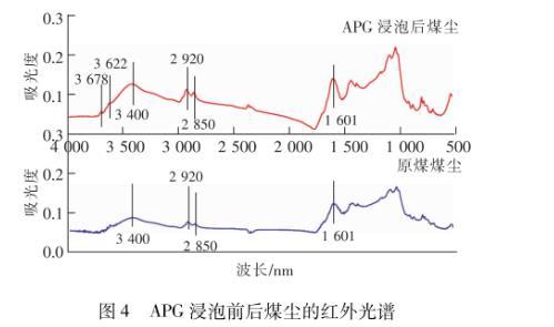 由上述實(shí)驗(yàn)結(jié)果可以看到,在8種表面活性劑中,非離子表面活性劑APG形成膠束和降低表面張力的能力最強(qiáng),潤(rùn)濕煤塵效果最好。通過測(cè)定APG浸泡前后煤塵表面官能團(tuán)及粒徑分布特征的變化,分析其潤(rùn)濕煤塵的作用機(jī)理。