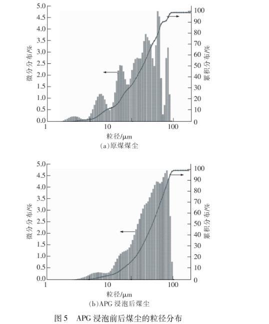由圖5可見,經(jīng)APG浸泡后煤塵粒徑增大。原煤煤塵的平均粒徑為22.62μm,經(jīng)APG浸泡后增大到3518μm。浸泡前煤塵的粒徑分布不均勻,粒徑眾數(shù)為48.41μm,浸泡后煤塵粒徑的均一性增強(qiáng),呈較典型的正態(tài)分布,粒徑眾數(shù)也增大至76.51μm。這說明煤塵表面親水官能團(tuán)的增加和分子間締合氫鍵的形成,促使煤塵之間發(fā)生了團(tuán)聚作用,使原本無法發(fā)生重力沉降的“小粒徑”煤塵變成了能夠發(fā)生重力沉降的“大粒徑”顆粒,加快了沉降速率,縮短了沉降時(shí)間,與煤塵沉降實(shí)驗(yàn)結(jié)果一致。