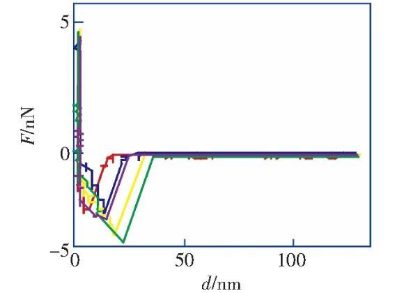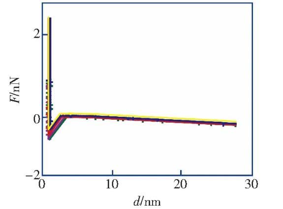 筆者利用原子力顯微鏡實驗測量了HOPG表面在醇-水替換前后的力距離曲線,發(fā)現(xiàn)醇-水替換前進針曲線的跳進距離小于5 nm,滿足DLVO理論;而在醇-水替換后納米氣泡覆蓋率為21.8%的情況下,進針曲線的跳進距離均大于10 nm,不能再用DLVO理論解釋,證明了IGE與納米氣泡共存這一現(xiàn)象。根據(jù)改進的Laplace-Young方程,結(jié)合文獻中對納米氣泡線張力值的計算結(jié)果,分析負的線張力對過渡區(qū)內(nèi)局部表面張力及局部固-液界面的影響,導致納米氣泡的接觸角反常小的原因之一。分析并討論雜質(zhì)對納米氣泡接觸角的影響,指出IGE與納米氣泡共存、線張力及雜質(zhì)影響的共同作用是導致納米氣泡接觸角“反常小”的原因。