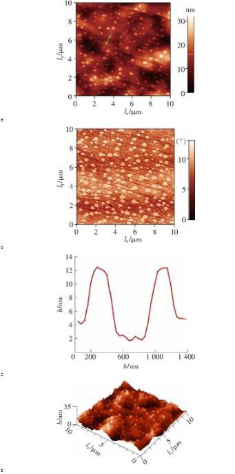 圖2a是探針在超純水中HOPG表面測得的力-位移曲線,當分離距離大于5 nm時,針尖和表面之間的作用力主要為斥力。由于實驗中的水呈弱酸性(PH約5.6),而研究表明,HOPG表面在弱酸性水中帶弱負電荷,探針針尖(單晶硅)在水中也認為是帶弱負電荷。因此,這個斥力可以解釋為雙電層(Electrostatic double layer,EDL)引起的。當分離距離小于5 nm時,在范德華力的作用下,針尖產(chǎn)生‘跳進’(jump in)現(xiàn)象并與HOPG表面接觸,整個力曲線符合DLVO理論。醇-水替換之后,在10 10掃描區(qū)域內(nèi)采用Taping-Mode模式(95%的set-point)以1 Hz的掃描頻率,如圖3a所示,HOPG表面上生成的納米氣泡呈球冠狀,相應的三維圖如圖3d所示。
