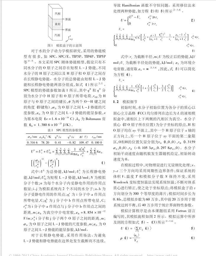 水是許多化學(xué)反應(yīng)過程廉價(jià)的反應(yīng)溶劑,也是化工生產(chǎn)過程常用的工質(zhì)。汽液界面行為是研究水相變傳熱問題的基礎(chǔ)。目前,工程上許多有關(guān)水蒸發(fā)、水蒸氣冷凝、加熱干燥等相變傳熱數(shù)據(jù)仍主要依賴于實(shí)驗(yàn)。隨著分子模擬技術(shù)的發(fā)展,采用分子動(dòng)力學(xué)模擬方法,從分子水平揭示水汽液界面特性的研究,引起了國(guó)內(nèi)外許多學(xué)者的極大關(guān)注。本文擬采用SPC模型,對(duì)水汽液界面特性進(jìn)行平衡分子動(dòng)力學(xué)模擬研究,探討溫度、截?cái)喟霃?、模擬分子數(shù)對(duì)水汽液界面特性的影響規(guī)律。