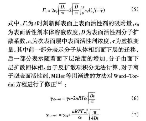 表面活性劑分子在新鮮表面上的吸附分兩步進(jìn)行:(1)分子從本體溶液到次表面的遷移;(2)分子在次表面和表面間的吸附平衡。在動態(tài)吸附模型的基礎(chǔ)上提出了兩種主要的動態(tài)吸附機(jī)理:擴(kuò)散控制吸附、混合動力控制吸附。