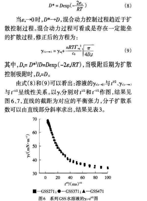 從表3可知,吸附初期GSS的擴(kuò)散系數(shù)較吸附后期大2~3個數(shù)量級。表明GSS分子自本體溶液擴(kuò)散到次表面的速度遠(yuǎn)大于在氣液界面與次表面之間的交換速度,因?yàn)樵谖匠跗冢╰→0),新鮮表面不存在吸附勢壘,屬擴(kuò)散控制吸附;吸附后期(t→∞),在氣液界面吸附的GSS分子由于相互作用產(chǎn)生的位能壘、離子頭基間的靜電斥力以及分子的定位重排等共同作用導(dǎo)致了混合動力擴(kuò)散控制。