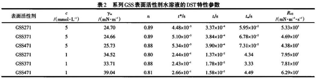以GSS271為例,濃度越高,表面活性劑分子的擴(kuò)散推動力越大,于氣液界面吸附越快,DST下降越顯著,因而誘導(dǎo)區(qū)結(jié)束的時間越早,越易達(dá)到介平衡,這與γm、ti、tm較小吻合;t*值隨濃度增大而減小,表明吸附后期勢壘隨濃度增大而增大,因?yàn)闈舛容^高時,更多的GSS271分子吸附于表面,由于空間位阻、分子間靜電斥力的影響,阻礙了新的GSS271分子吸附,吸附勢壘變大。濃度高時,R1/2大,動態(tài)表面活性好。