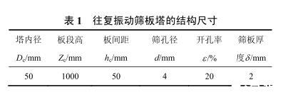 表1往復(fù)振動篩板塔的結(jié)構(gòu)尺寸