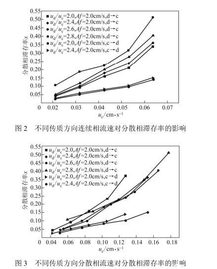 分散相滯存率是分散相液滴體積占有效萃取總體積的分數(shù)。體積置換法是測定分散相滯存率常用的方法之一。當實驗運行穩(wěn)定后,在設(shè)備的上澄清段(正丁醇作分散相)或下澄清段(水作分散相)出現(xiàn)兩相界面,記錄該界面的位置H1,然后關(guān)閉兩相的進、出口,停止篩板振動,當分散相液滴全部聚并,記錄輕重兩相的界面位置H2,由H1和H2計算分散相體積。有效萃取總體積是分散相入口到出口之間的體積。