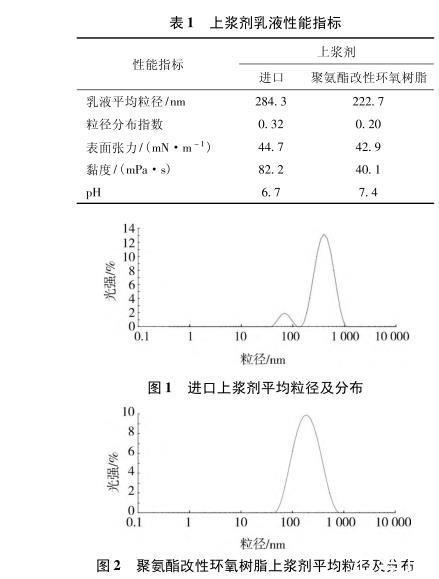 與進口上漿劑相比,制備的上漿劑乳液粒徑穩(wěn)定,變化率小,可穩(wěn)定保存;黏度低,不易沾輥絮化;pH呈中性。