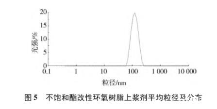 制備的不飽和酯改性環(huán)氧樹(shù)脂上漿劑乳液的性能測(cè)試結(jié)果見(jiàn)表5,粒徑及分布測(cè)試結(jié)果見(jiàn)圖5。