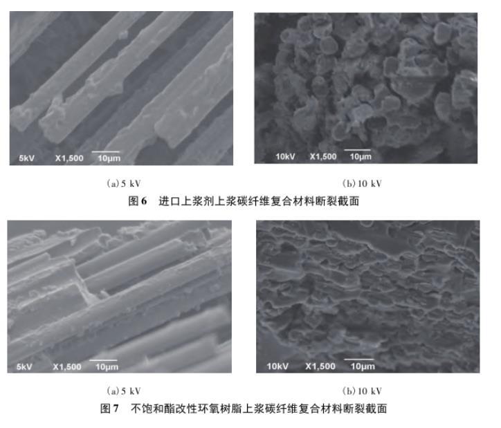 采用進(jìn)口上漿劑和不飽和酯改性環(huán)氧樹(shù)脂上漿劑制備的上漿碳纖維復(fù)合材料斷裂截面見(jiàn)圖6~7。