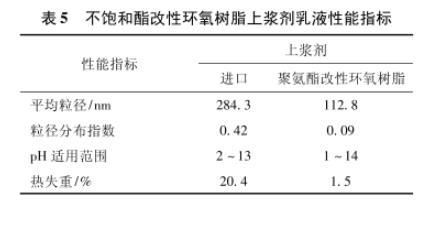 由表5結(jié)果可見(jiàn):不飽和酯改性環(huán)氧樹(shù)脂上漿劑為微乳液,平均粒徑更小,離心沉淀量低,更易長(zhǎng)時(shí)間儲(chǔ)存應(yīng)用;可在較寬的pH范圍內(nèi)保持穩(wěn)定,熱失重程度小,耐溫性高,可滿足各種不同復(fù)合材料樹(shù)脂基體高溫、中溫、低溫加工工藝的需求。