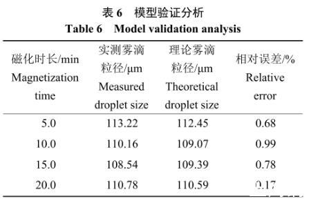為驗證350 mT磁場強度時霧滴粒徑調(diào)控模型的實際應(yīng)用價值,參考磁化除草劑溶液霧滴粒徑的試驗設(shè)計,在磁場強度為350 mT前提下,對除草劑溶液分別循環(huán)磁化5.0、10.0、15.0、20.0 min,實測霧滴粒徑與模型理論霧滴粒徑見表6,經(jīng)過分析,實測值與理論值相對誤差均小于1%,此模型具有實際應(yīng)用價值。
