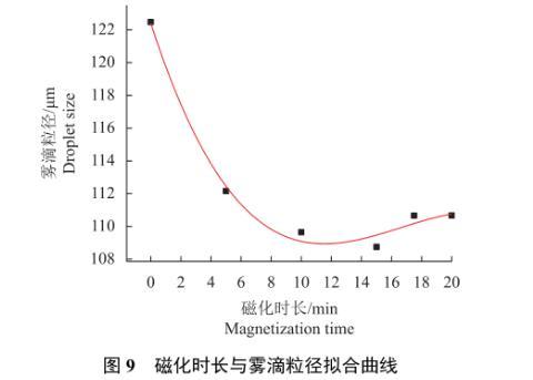 1)在0~500 mT磁場強度范圍內(nèi),當(dāng)磁場強度為350 mT、磁化時間為15.0 min時,表面張力最小,為54.0 mN/m,下降14.96%;噴霧霧滴粒徑最小,為108.75μm,下降11.20%。溶液表面張力和噴霧霧滴粒徑隨磁場強度和磁化時長的增加均呈現(xiàn)先下降后回升的趨勢,表明只有在特定磁場強度和磁化時長范圍內(nèi)磁化效果才最佳。