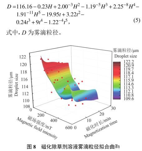 為直觀地分析霧滴粒徑變化情況,參照“2.2”表面張力數(shù)據(jù)擬合方法對噴霧霧滴粒徑進行多項式擬合、高斯擬合和洛倫茲擬合,但高斯擬合與洛倫茲擬合在達到最大迭代次數(shù)之后擬合結(jié)果仍不收斂,所以采用多項式擬合模型。多項式擬合結(jié)果中,R2為0.833 6,調(diào)整后R2為0.787 4,RMSE為2.085 7,這說明擬合函數(shù)有意義且擬合程度較高,公式(5)為除草劑噴霧霧滴粒徑與磁場強度和磁化時長的函數(shù)關(guān)系式,圖8為磁化除草劑溶液霧滴粒徑擬合曲面。
