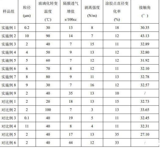 測(cè)試結(jié)果表明,當(dāng)膠液稀釋液表面張力在28mN/m以上時(shí),隔膜粘接劑組合物涂布并干燥后的膠點(diǎn)直徑變化率較小,當(dāng)表面張力太低時(shí),膠點(diǎn)直徑變化率較大,透氣增值變大。當(dāng)聚合物顆粒A粒徑在0.2-10μm,玻璃化轉(zhuǎn)變溫度在30-90℃范圍內(nèi)時(shí),隔膜同時(shí)具有較低的透氣增值以及更好的剝離強(qiáng)度。聚合物顆粒A粒徑太小時(shí),容易堵塞隔膜孔道造成透氣增值增大,并且剝離強(qiáng)度也較弱。聚合物顆粒A粒徑太大,聚合物顆粒A涂布后容易脫落,剝離強(qiáng)度降低。聚合物顆粒A玻璃化溫度太高,熱壓時(shí)無法軟化,剝離強(qiáng)度低;而玻璃化溫度太低則容易成膜,造成隔膜透氣增值變大。