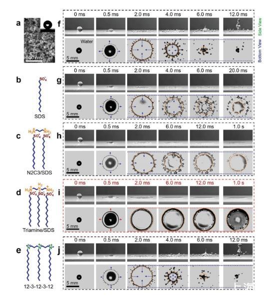 圖1.高速液滴撞擊超疏水表面的動(dòng)態(tài)行為。a)掃描電子顯微鏡(SEM)揭示了表面的微觀結(jié)構(gòu)。插圖:水接觸角為161.3±1.1°,確保超疏水性。b–e)表面活性劑的分子結(jié)構(gòu)。f)撞擊超疏水表面的水滴出現(xiàn)飛濺和反彈。g–j)分別含有SDS、N2C3/SDS、三胺/SDS和12-3-12-3-12添加劑的水滴在超疏水表面上的撞擊動(dòng)力學(xué)的側(cè)面和仰視圖。g,h)含有SDS或N2C3/SDS添加劑的液滴抑制了反彈,但仍會(huì)產(chǎn)生飛濺或后退破碎。i)含有三胺/SDS的液滴一旦與基材接觸就會(huì)形成穩(wěn)定的周邊邊緣,隨后完全沉積在超疏水表面上而不會(huì)發(fā)生任何飛濺或碎裂。完全均勻的潤濕膜在達(dá)到最大擴(kuò)散面積后保持不變。j)合成低聚表面活性劑12-3-12-3-12添加劑對水滴的影響影響不大。濺射和反彈仍然會(huì)發(fā)生。箭頭的長度表示擴(kuò)散或反彈速度的變化。