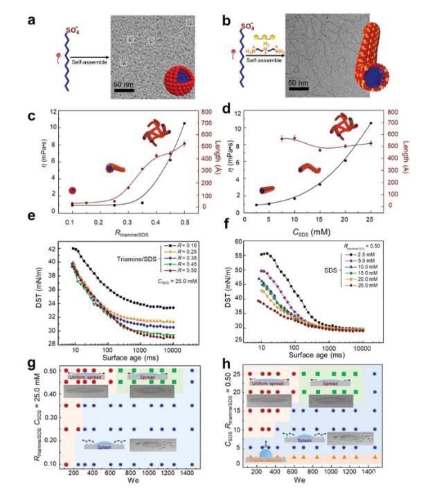 圖2.撞擊結(jié)果的物理化學(xué)性質(zhì)和相圖。a,b)SDS和三胺/SDS聚集狀態(tài)的示意圖和低溫透射電鏡圖像。a)單獨(dú)的SDS形成小的球形膠束,用虛線矩形突出顯示。b)加入三胺后,三胺/SDS形成長而密集的纏結(jié)線性膠束。c,d)在不同摩爾比R和摩爾濃度CSDS下三胺/SDS的粘度和聚集長度。在臨界摩爾比或摩爾濃度之后,膠束伸長并纏結(jié)成網(wǎng)絡(luò)結(jié)構(gòu),導(dǎo)致粘度急劇增加。e,f)不同R和CSDS下三胺/SDS的動(dòng)態(tài)表面張力(DST)曲線。隨著R和CSDS的增加,初始和平衡表面張力均顯著降低。g,h)不同We數(shù)下三胺/SDS液滴撞擊超疏水表面的動(dòng)態(tài)行為相圖。在高We下,含有三胺/SDS添加劑的液滴只有在特定的摩爾比(0.45–0.50)和特定的摩爾濃度(>20.0×10?3 m)下才能完全沉積在超疏水表面上。