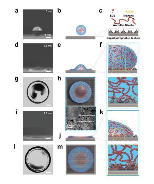 圖3.活性低聚表面活性劑高速撞擊超疏水表面后均勻鋪展的示意圖。a、b)液滴包含三維纏結(jié)的蠕蟲狀膠束網(wǎng)絡(luò)。c)SDS、三胺、蠕蟲狀膠束和具有微/納米結(jié)構(gòu)的超疏水表面的示意圖。d–h)表面活性劑分子快速擴(kuò)散到新形成的界面,并緊密堆積在水-空氣界面。蠕蟲狀膠束被迫伸展以固定水。在快速擴(kuò)散過程中,擴(kuò)散邊緣穩(wěn)定且均勻。h)蠕蟲狀膠束的密集網(wǎng)絡(luò)纏繞著基底的微納米結(jié)構(gòu),三胺/SDS液滴撞擊后的低溫掃描電鏡圖像支持了這一觀點(diǎn),其中較大的圖像顯示了較小圖像底部的網(wǎng)絡(luò)。f)表面活性劑分子與基質(zhì)具有很強(qiáng)的相互作用,蠕蟲狀膠束網(wǎng)絡(luò)與基質(zhì)的微/納米結(jié)構(gòu)纏繞在一起。i–m)在最終平衡狀態(tài)下,致密的蠕蟲狀膠束存在于擴(kuò)散外圍并與微/納米結(jié)構(gòu)纏繞在一起。左欄中所有液滴的比例尺均為1毫米。