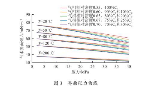 如圖3所示為利用新模型繪制的不同溫度和壓力下的界面張力曲線。從圖中可知,壓力越大,溫度越高,氣水界面張力越?。粴怏w相對密度越大,氣水界面張力越小。當壓力和溫度分別為0~40 MPa和20~200℃時,界面張力范圍為30~75 mN/m,不能看成常數(shù)。