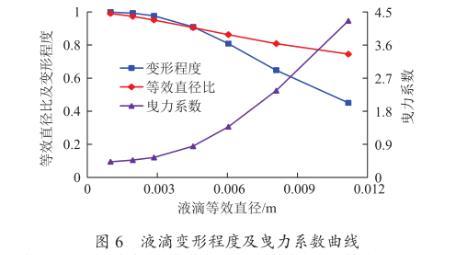 (2)液滴尺寸和液滴變形。如圖6所示為壓力15 MPa,溫度50℃時(shí)不同液滴尺寸下液滴變形程度、曳力系數(shù)的變化趨勢。從中可知,當(dāng)液滴特別小時(shí)(1 mm),等效直徑比及變形程度系數(shù)接近1,曳力系數(shù)近似0.44,液滴呈球形基本不發(fā)生變形;隨著液滴尺寸從1 mm增大到10 mm時(shí),等效直徑比從1減小到0.75,變形程度系數(shù)從1減小到0.45,曳力系數(shù)從0.44增大到4.3,液滴呈橢球形變形程度逐漸加大。