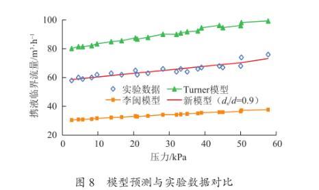 (3)液滴尺寸和變形對攜液臨界流量影響較大。當(dāng)液滴特別小時(shí),液滴在壓差下基本不發(fā)生形變,液滴基本呈球形,曳力系數(shù)近似0.44;隨著液滴直徑越大,液滴越容易變形,液滴高寬比越小,曳力系數(shù)越大,攜液臨界流速變小??紤]了液滴尺寸和液滴變形影響的新模型與實(shí)驗(yàn)數(shù)據(jù)吻合良好。