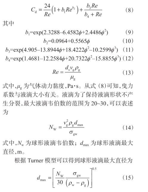 式中,φ為液滴變形程度系數(shù),為與變形液滴體積相等的等效球形表面積與實(shí)際液滴表面積的比值。當(dāng)氣液相對速度不大時(shí),液滴保持球形,可以利用球形液滴曳力系數(shù)計(jì)算攜液臨界流量,但是當(dāng)液滴發(fā)生變形以后,曳力系數(shù)和液滴迎風(fēng)面積相應(yīng)的發(fā)生改變,用球形液滴曳力系數(shù)計(jì)算誤差可能高達(dá)30%,對于非球形剛性顆粒,可以應(yīng)用如下曳力系數(shù)表達(dá)式進(jìn)行計(jì)算: