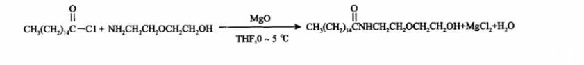 1.2.1棕櫚酸二甘醇酰胺的合成稱(chēng)取9.10 g二甘醇胺,放入裝有攪拌器、溫度計(jì)和恒壓漏斗的500 mL三口燒瓶中,并加入約70 mL水。通過(guò)冰浴將溫度控制在0~5℃范圍內(nèi),加入溶劑210 mL(V(水)∶V(四氫呋喃)=1∶3)及氧化鎂16.80 g(n(氧化鎂)∶n(二甘醇胺)=5∶1)。攪拌約30 min后,稱(chēng)取22.88 g棕櫚酰氯溶解于70 mL四氫呋喃,轉(zhuǎn)移到恒壓漏斗中,緩慢滴加到三口瓶中,滴加時(shí)間為0.5 h左右,在0~5℃下攪拌反應(yīng)2~2.5 h。反應(yīng)物物質(zhì)的量比為n(棕櫚酰氯)∶n(二甘醇胺)=1∶1.02。反應(yīng)結(jié)束后將反應(yīng)混合物倒入布氏漏斗中抽濾,除去過(guò)量的氧化鎂和生成的氯化鎂,收集濾液,旋蒸除去溶劑,最后于55℃下真空干燥12 h,得到目標(biāo)產(chǎn)物,外觀為白色粉末。