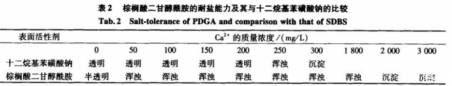 表2棕櫚酸二甘醇酰胺的耐鹽能力及其與十二烷基苯磺酸鈉的比較