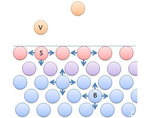 在水中,如B所示,內(nèi)部水分子所受鄰近相同分子的作用力是對(duì)稱的,各方向的力相互抵消。但物質(zhì)表面層分子與內(nèi)部分子周圍的狀況不同,水最外層分子會(huì)受到整個(gè)水滴內(nèi)部分子的斥力,而抵消這個(gè)斥力的便是水的表面張力。